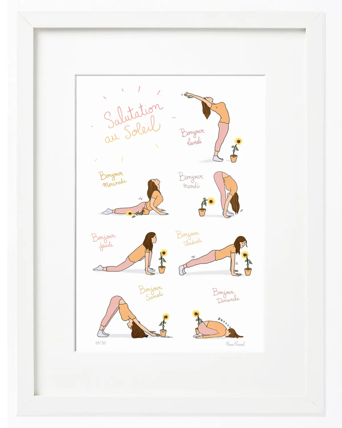 Apportez une touche de douceur et d’inspiration à votre intérieur avec cette illustration originale représentant les jours de la semaine accompagnés d’étirements de Yoga. Chaque jour de la semaine met en scène un étirement différent, invitant à prendre un moment pour soi et à relâcher les tensions accumulées.
